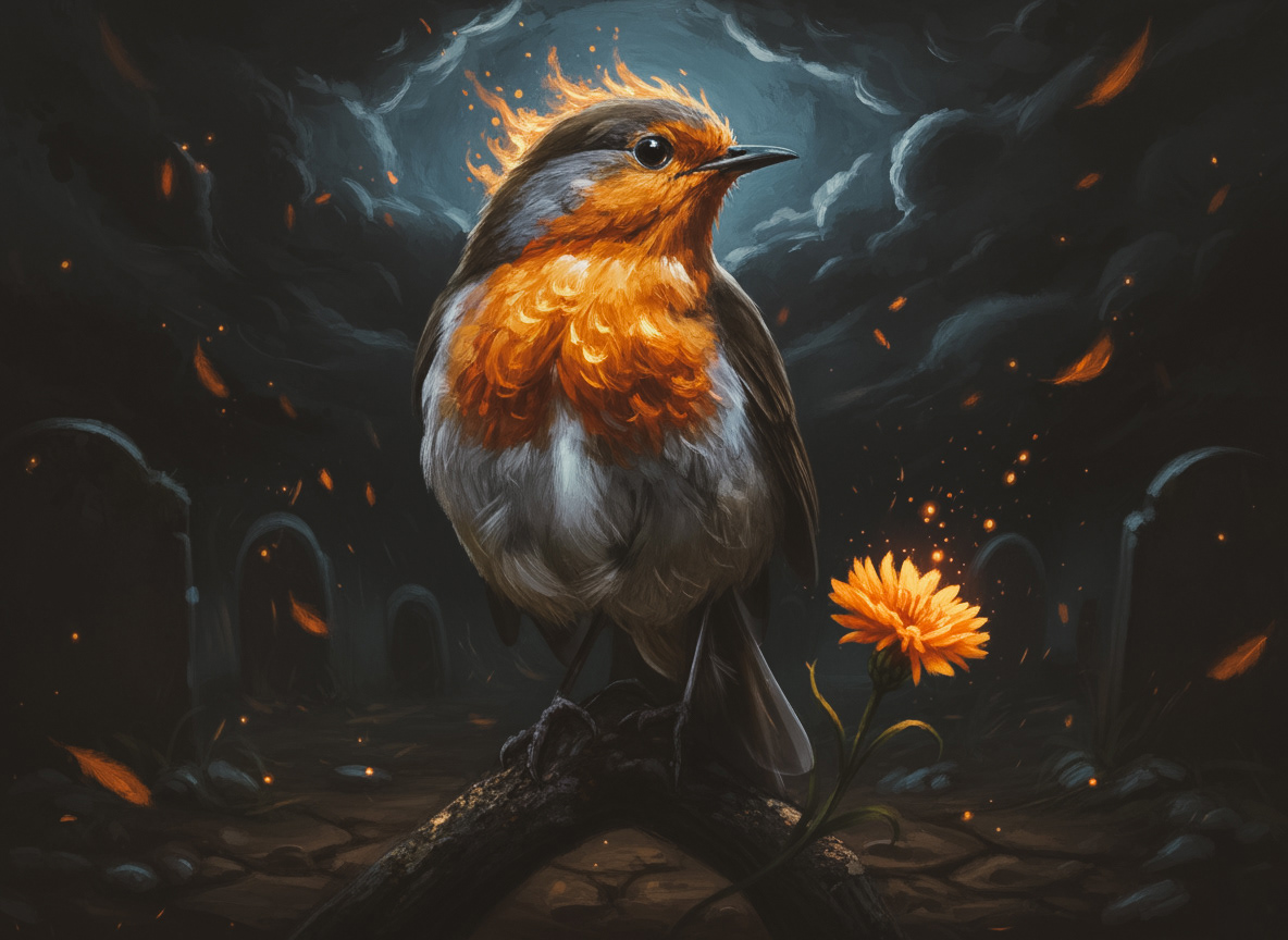 Wiederkehr des Lichts: In vielen Mythen und Legenden sind Vögel – besonders solche mit leuchtendem Gefieder – Boten der Hoffnung. Das Rotkehlchen könnte hier als Symbol für die Rückkehr des Lichts in die Dunkelheit stehen, sei es als metaphorische Wiedergeburt oder als Führer verlorener Seelen.